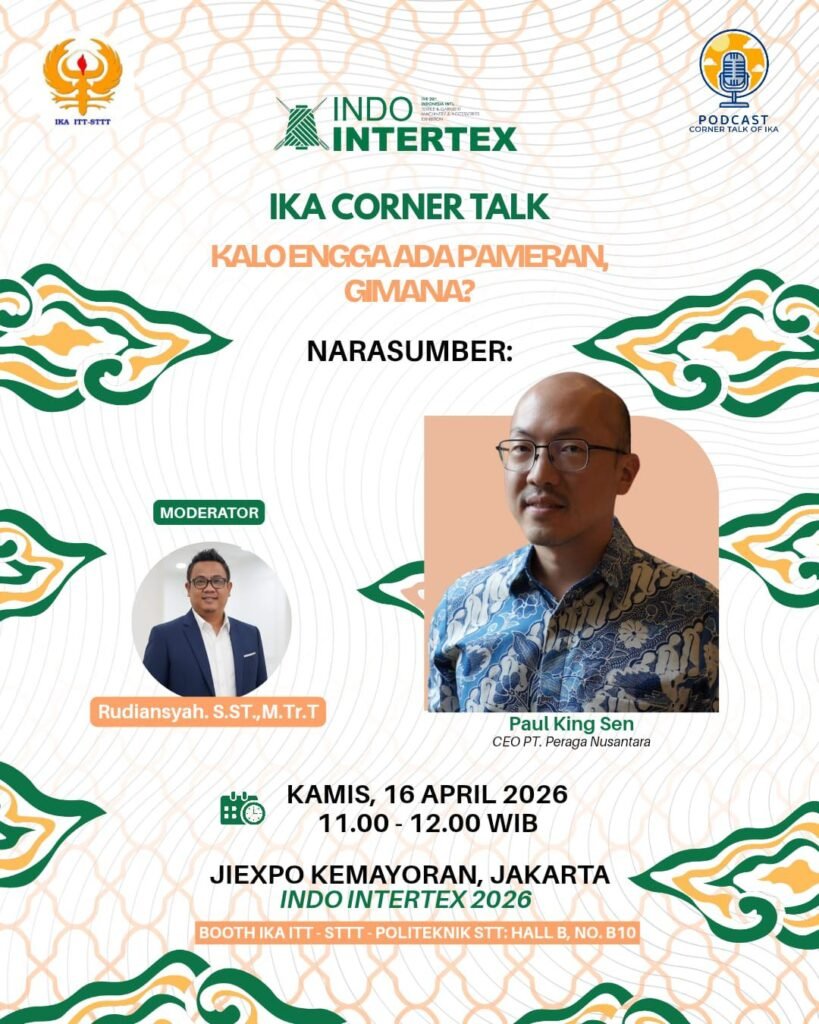 IKA Corner Talk**Kamis, 16 April 2026**11.00 – 12.00 WIB**KALAU ENGGA ADA PAMERAN, GIMANA?*Narasumber :*Paul King Sen**CEO PT. PERAGA NUSANTARA**Moderator**Rudiansyah. S.ST.,M.Tr.T*JIEXPO Kemayoran, JakartaIndo Intertex 2026Booth IKA ITT – STTT – Politeknik STTT : Hall B, No. B10Kanal medsos IKA ITT – STTT – Politeknik STTT 2023/2027:https://linktr.ee/IKAITTSTTTBANDUNG